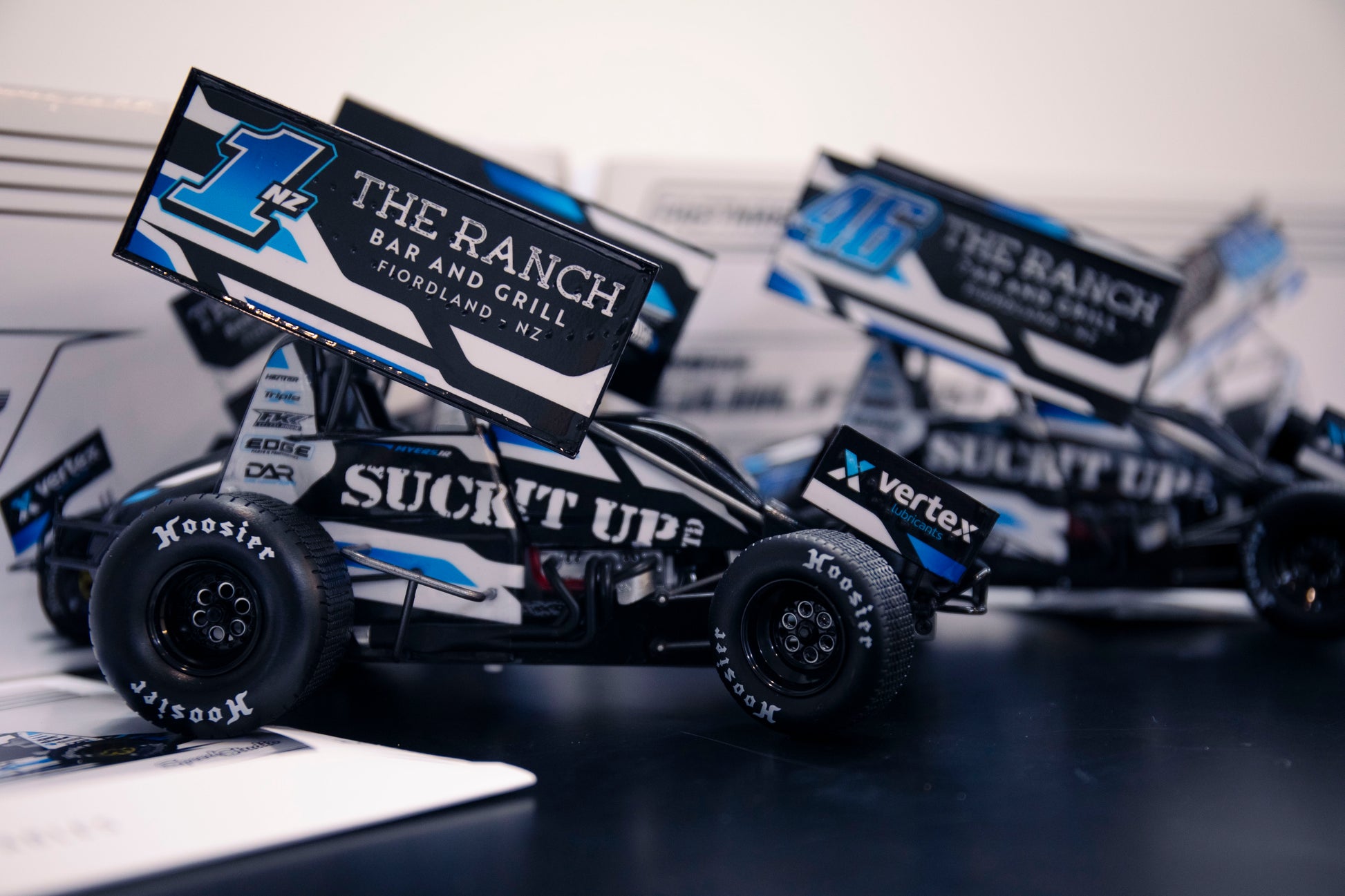 An additional display feature is the pose-able steering and the distinctive block-tread Hoosier Sprint tyres, which means this model can be displayed in an aggressive "opposite-lock" stance.